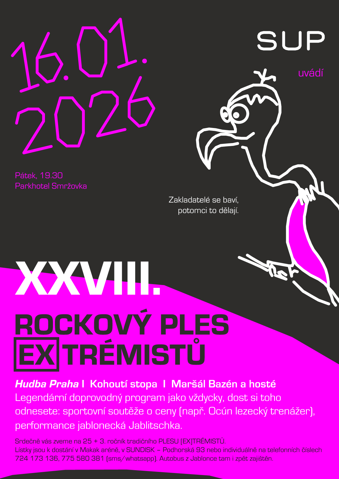 SUP uvádí už XXVIII. = 25. + 3. ročník tradičního PLESU (EX)TRÉMISTŮ. Hrají Hudba Praha, Kohoutí stopa, Maršál Bazén a hosté. V Parkhotelu na Smržovce.Bezva muzika, tombola, doprovodný program, soutěže.. jako vždycky.